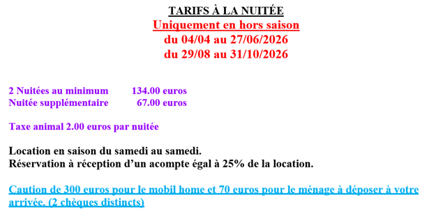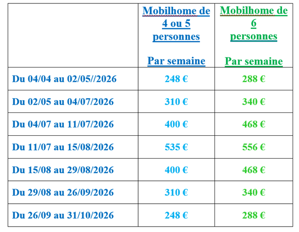 TARIFS LOCATION MOBILHOME A LA SEMAINE